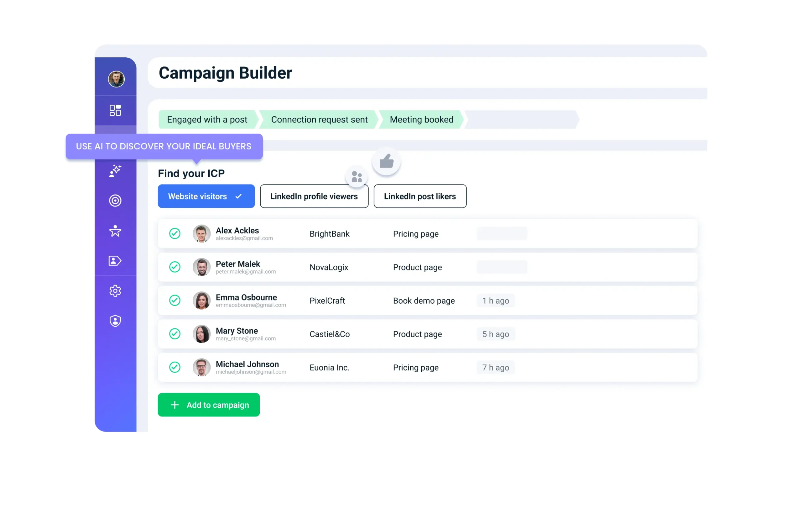 Grow your LinkedIn network faster and engage with them in a more personalized way. Add more touchpoints to your outreach, track product champions and ideal prospects who change jobs, only go for people who are active on socials.