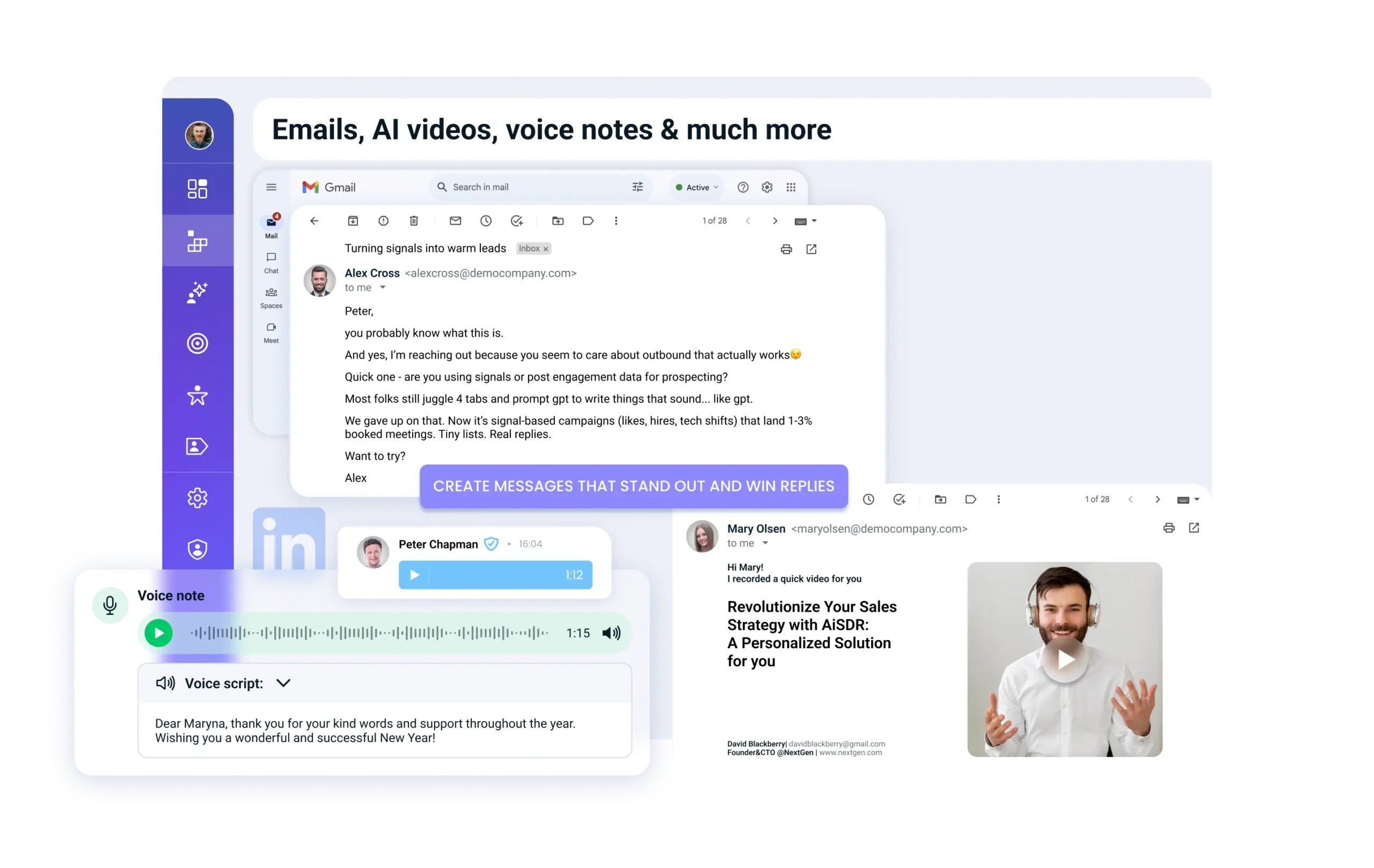 meaningful emails, LinkedIn, and text messages personalized from 323+ data sources.