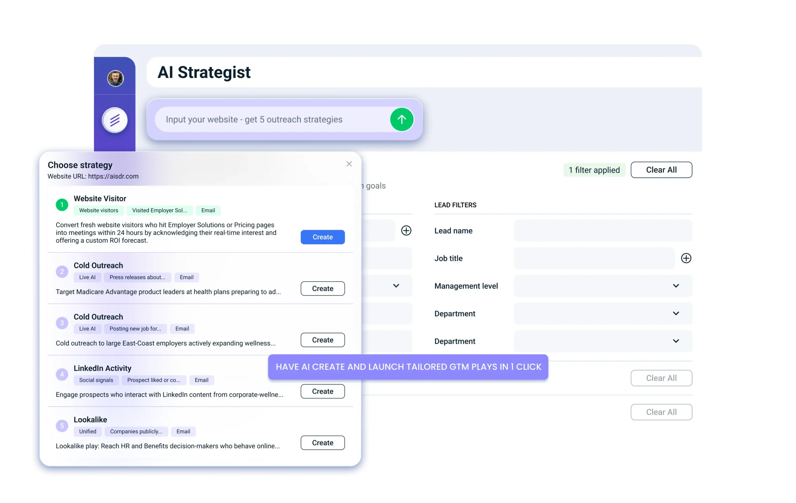 Lookalike campaigns, job changes, new hires, and retargeting high-intent website visitors are a few of the many GTM plays the AI can run for you. AiSDR also lets you consolidate your email outreach tools into one SDR solutions platform, potentially saving more than 50% of your software cost.