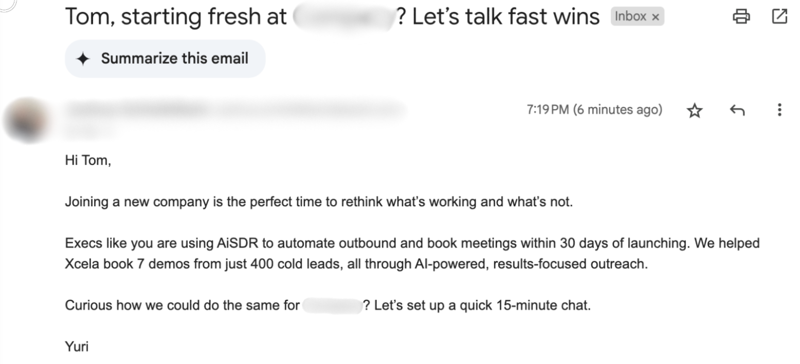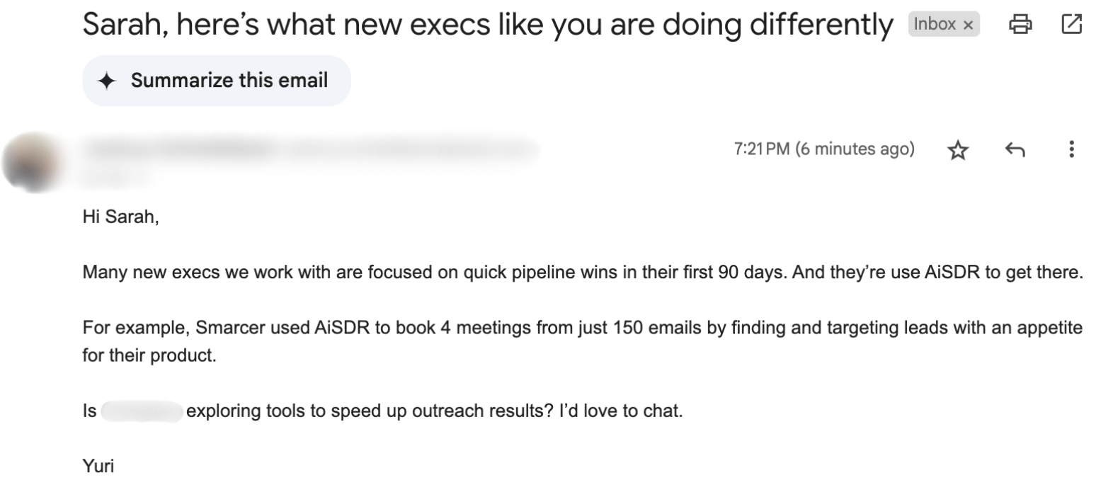 New hires don’t want fluff. Provide the AI with use cases and value props messaging that deliver quick, visible results in 30–90 days. Think cost savings, ROI, time-to-value, or plug-and-play implementation. The AI will tailor the intro, tone, messaging style, and use case to match.