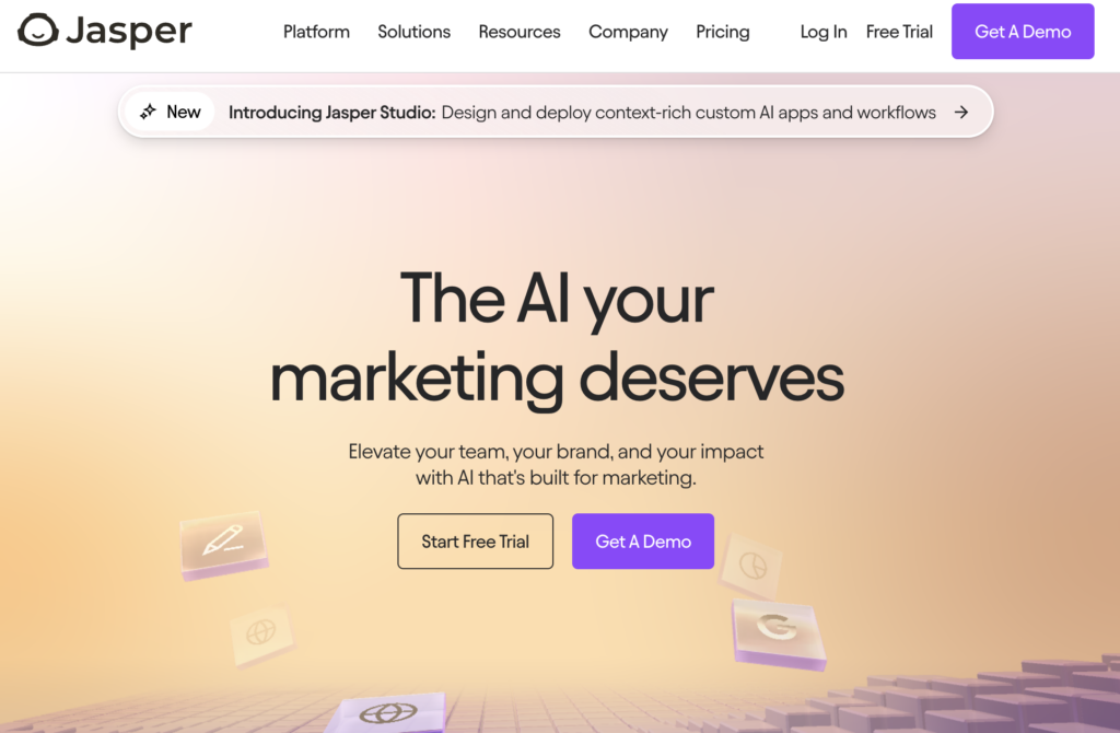 Jasper provides 80+ marketing apps for creating all sorts of content: blog posts, landing pages, marketing briefs, video/podcast scripts, presentation slides, etc.