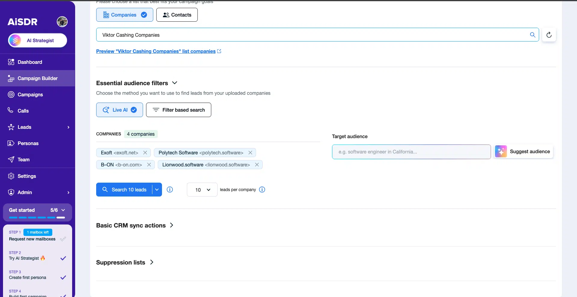 Now you can connect a list of companies directly to AiSDR, set filters like job title, seniority, or location, and let our Live AI automatically find verified contacts that match your criteria. AiSDR then pulls those leads straight into your campaign so you can move from synced data to outreach in one smooth flow.
