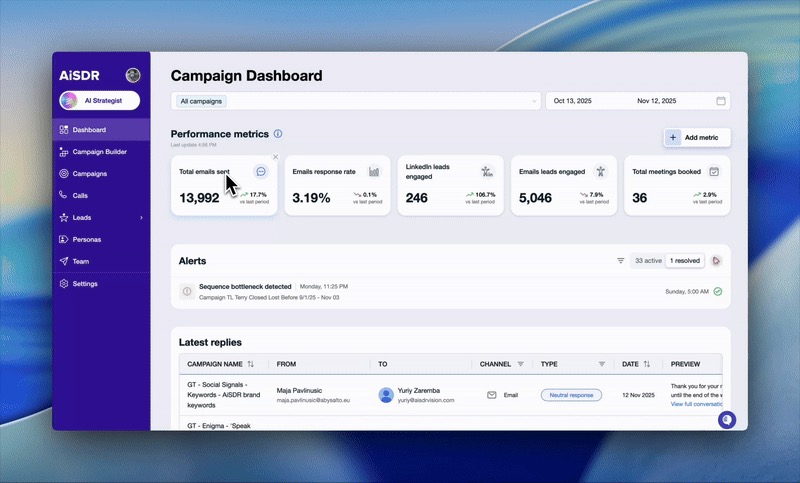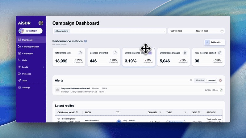 AiSDR surfaces these alerts as it detects them so you can take action before they stall campaign momentum.