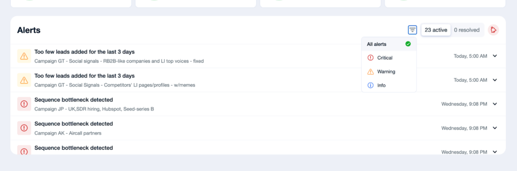 Picture this: It’s Monday morning. You open AiSDR and spot a yellow ⚠️ alert – Your top-performing campaign isn’t pulling in enough new leads.
