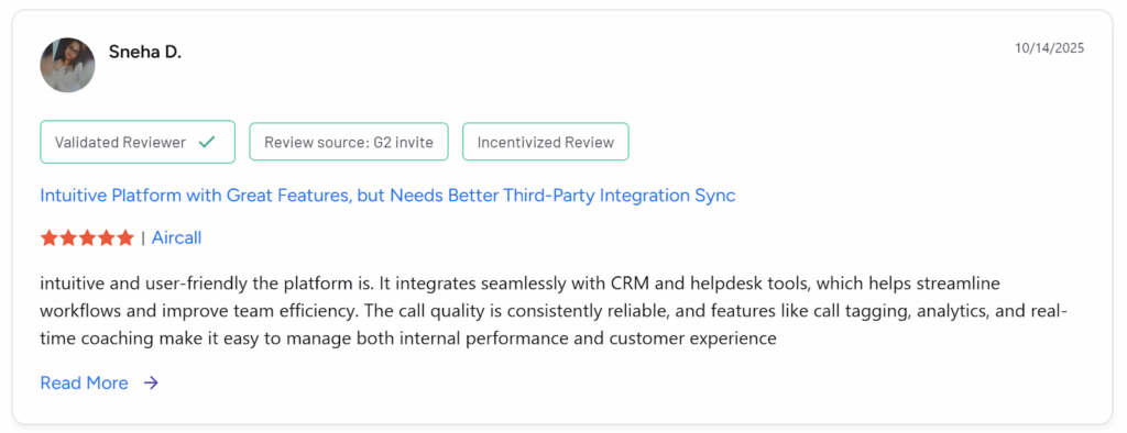 Alt text: Aircall review by Sneba D., manager in product sales. Source