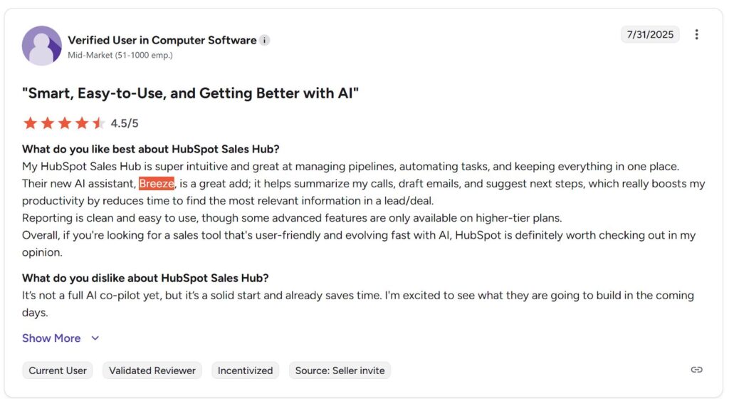 Alt text: Breeze review from a verified user in the computer software industry. Source