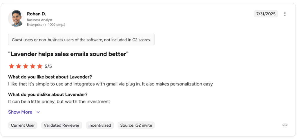 Alt text: Lavender review by Rohan D., business analyst. Source