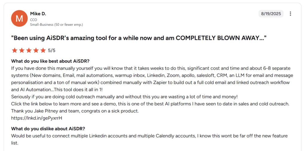 Alt text: AiSDR review by Mike D., CCO. Source