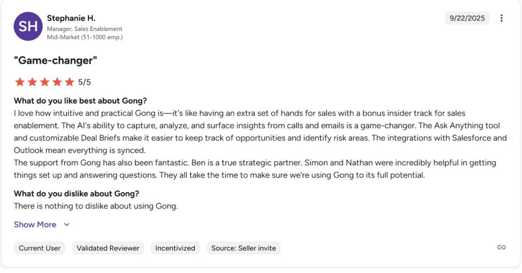 Alt text: Gong review by Stephanie H., manager in sales enablement. Source
