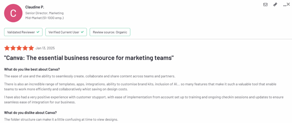 Alt text: Canva review by Clausine P., senior director. Source