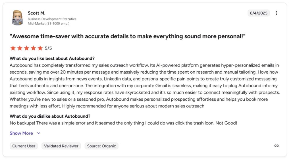 Alt text: Autobound review by Scott M., business development executive. Source