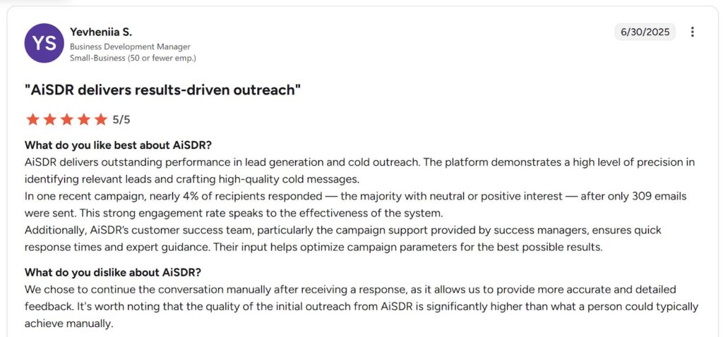 Alt text: AiSDR review by Yevheniia S., business development manager. Source