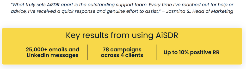 Alt text: AiSDR review by Jasmina S, head of marketing at SDR. Source