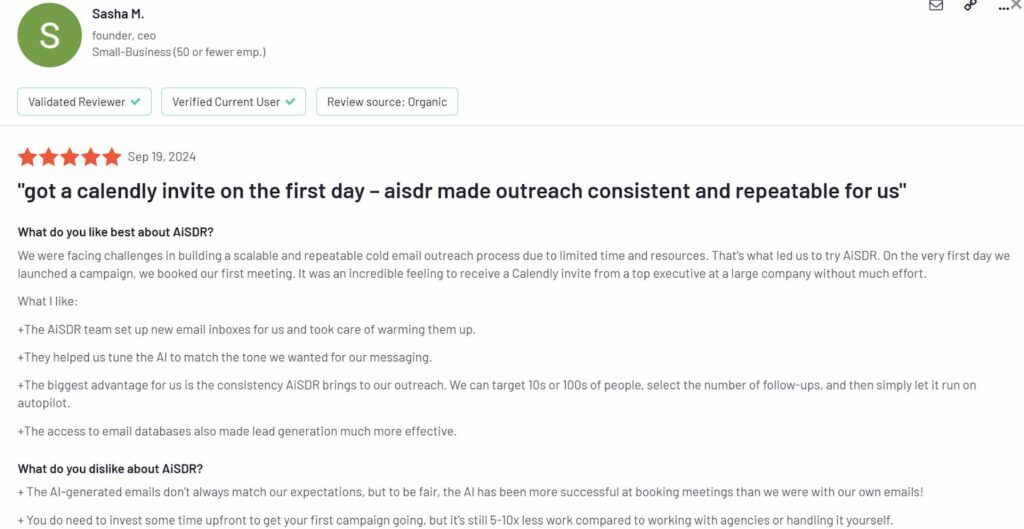 Alt text: AiSDR review by Sasha M., founder and CEO. Source