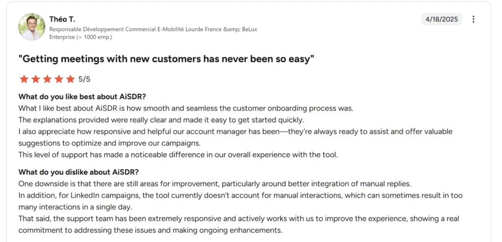 Alt text: AiSDR review by Theo T., Responsable Développement Commercial. Source