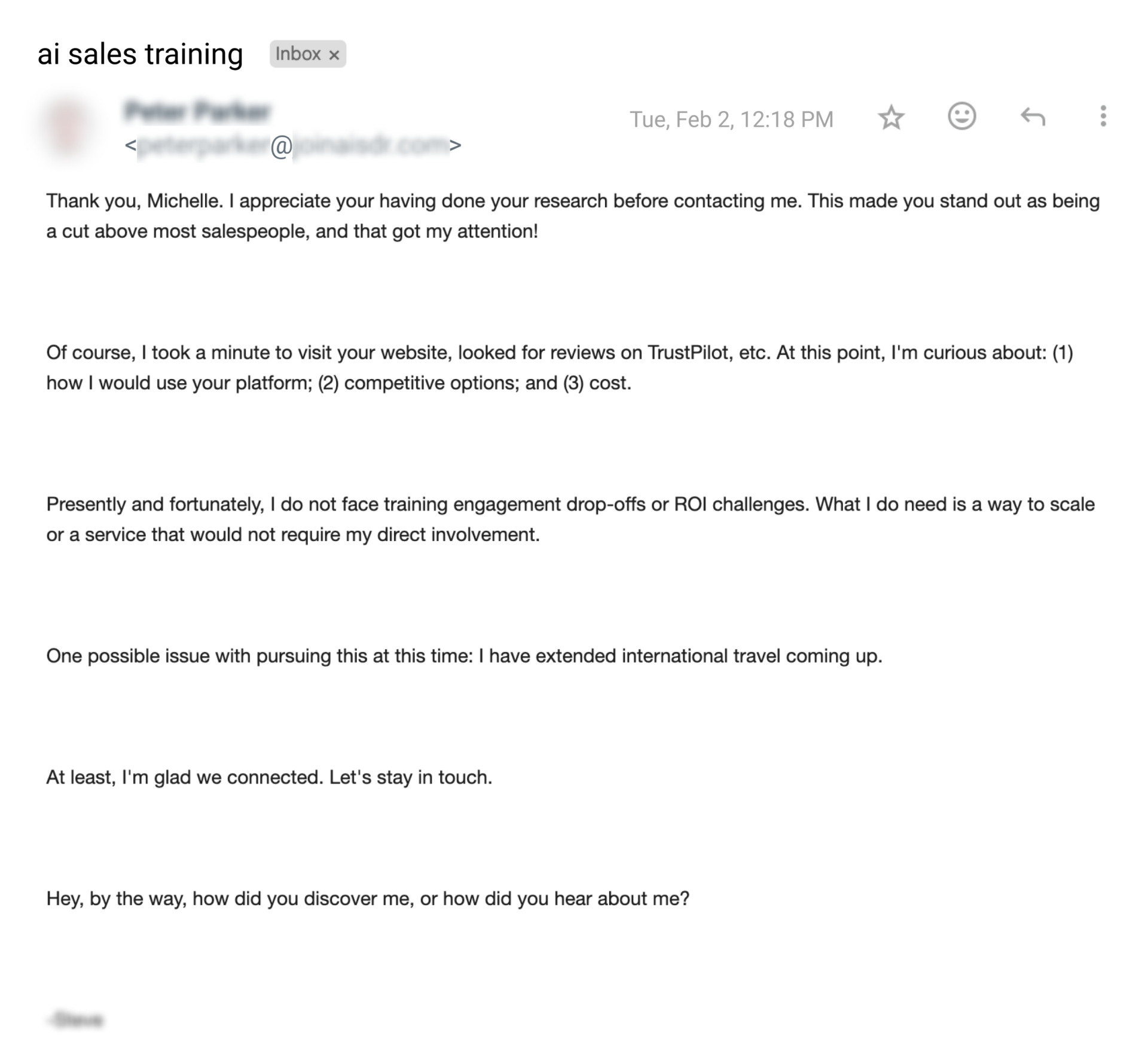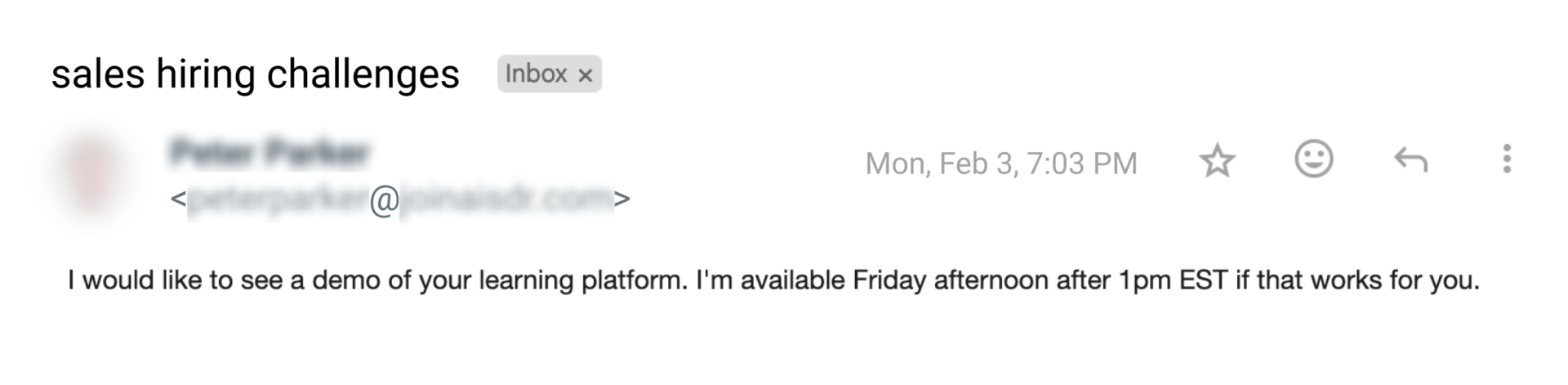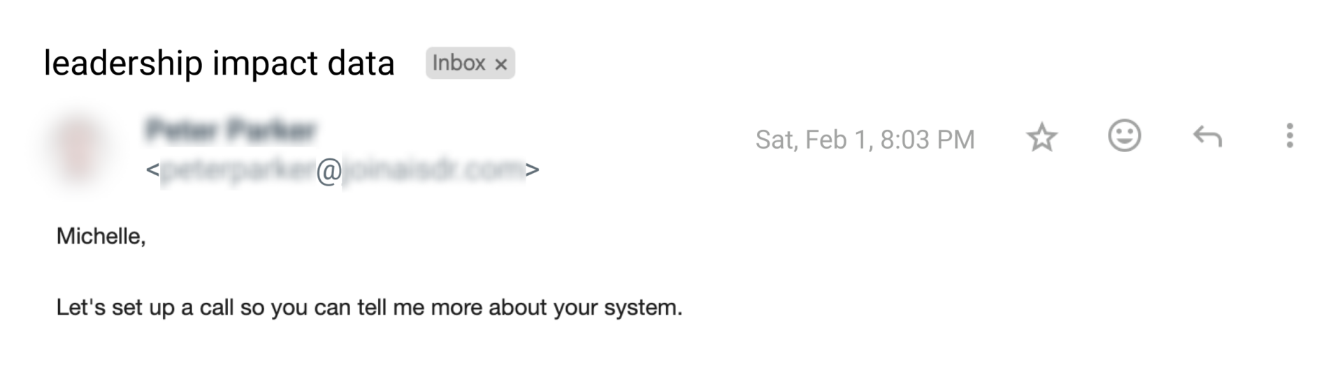 See how AiSDR runs your outreach Let AiSDR try and convince you to book a meeting with us 😉