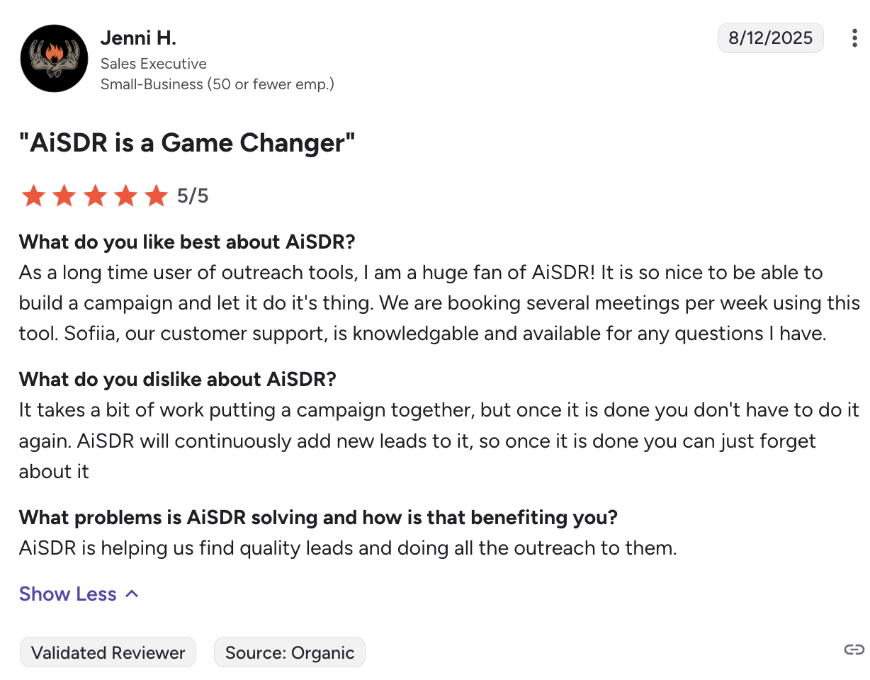 AiSDR is exactly what our sales team needed to start up and run our cold outbound. We’ve been able to expand our outreach through AI-powered conversations to potential customers in Asia and the Middle East in less time than it would’ve been had we hired a new sales representative.